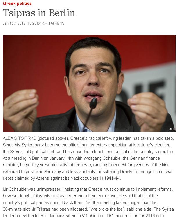Όσο για την συνάντηση του Αλέξη Τσίπρα με τον γερμανό υπουργό Οικονομικών, Βολφγκανγκ Σόιμπλε, στο Βερολίνο, το περιοδικό σχολιάζει: «Ο κ. Τσίπρας παρουσίασε με ευγένεια μία λίστα αιτημάτων, μεταξύ των οποίων λιγότερα μέτρα λιτότητας για τους Έλληνες αλλά και την καταβολή των οφειλόμενων πολεμικών αποζημιώσεων από την γερμανική κυβέρνηση».