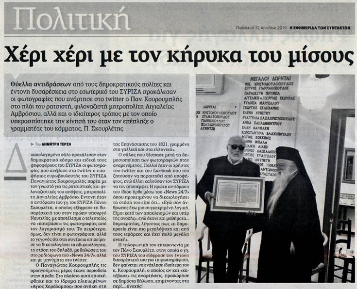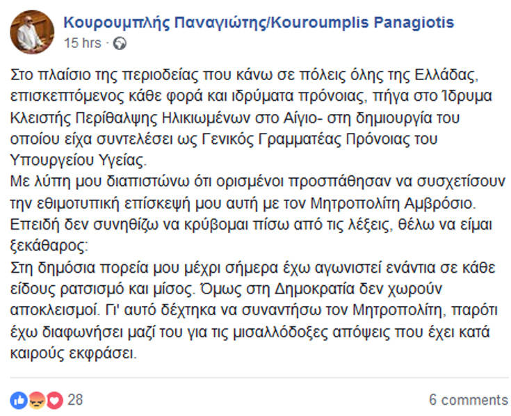 Στη δημόσια πορεία μου μέχρι σήμερα έχω αγωνιστεί ενάντια σε κάθε είδους ρατσισμό και μίσος. Όμως στη Δημοκρατία δεν χωρούν αποκλεισμοί. Γι’ αυτό δέχτηκα να συναντήσω τον Μητροπολίτη, παρότι έχω διαφωνήσει μαζί του για τις μισαλλόδοξες απόψεις που έχει κατά καιρούς εκφράσει» έγραψε ο Παναγιώτης Κουρουμπλής.