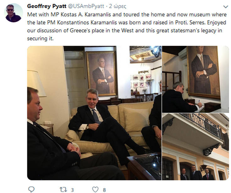 Ο κ. Πάιατ είχε, όπως και ο ίδιος σημειώνει σε ανάρτησή του στο Twitter, «απολαυστική» συζήτηση με τον βουλευτή Σερρών της ΝΔ, Κώστα Καραμανλή για τη θέση της Ελλάδας στη Δύση και την παρακαταθήκη του μεγάλου πολιτικού άνδρα στη διασφάλιση της θέσης αυτής, όπως αναφέρει το Αθηναϊκό Πρακτορείο Ειδήσεων.