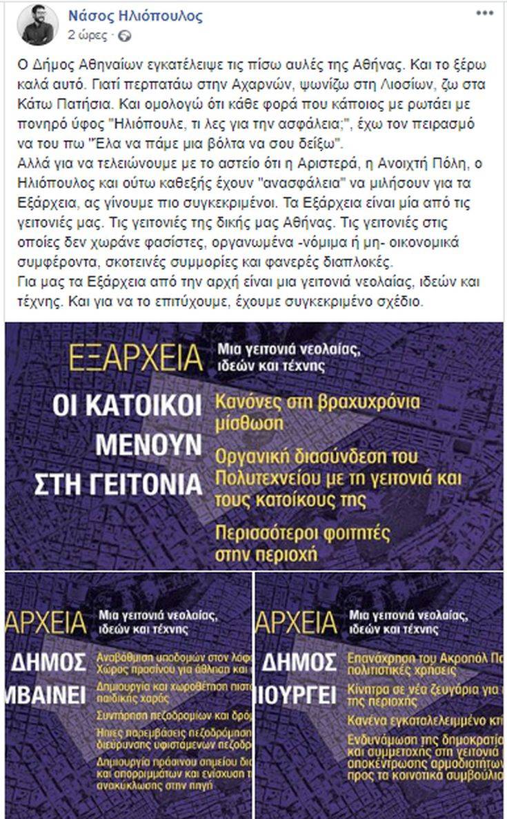 Σε συνέχεια της χθεσινής εκδήλωσης της «Ανοιχτής Πόλης» για την ασφάλεια στην Αθήνα, ο Νάσος Ηλιόπουλος, με σημερινή του ανάρτηση στην προσωπική του σελίδα στο Facebook, επανέρχεται στο θέμα των Εξαρχείων.