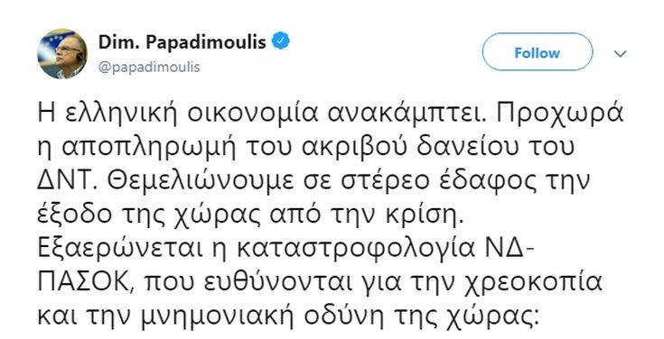 Σε ανάρτησή του στο Twitter, ο υποψήφιος ευρωβουλευτής του ΣΥΡΙΖΑ αναφέρει: «Η ελληνική οικονομία ανακάμπτει. Προχωρά η αποπληρωμή του ακριβού δανείου του ΔΝΤ. Θεμελιώνουμε σε στέρεο έδαφος την έξοδο της χώρας από την κρίση. Εξαερώνεται η καταστροφολογία ΝΔ-ΠΑΣΟΚ, που ευθύνονται για τη χρεοκοπία και τη μνημονιακή οδύνη της χώρας».