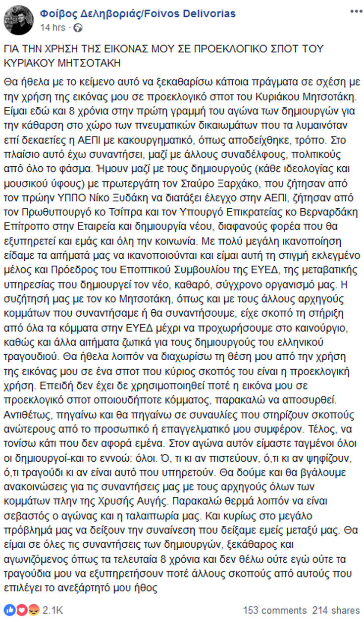 Και ο Φοίβος Δεληβοριάς σε ανάρτησή του σημειώνει πως «Θα ήθελα με το κείμενο αυτό να ξεκαθαρίσω κάποια πράγματα σε σχέση με την χρήση της εικόνας μου σε προεκλογικό σποτ του Κυριάκου Μητσοτάκη. Είμαι εδώ και 8 χρόνια στην πρώτη γραμμή του αγώνα των δημιουργών για την κάθαρση στο χώρο των πνευματικών δικαιωμάτων που τα λυμαινόταν επί δεκαετίες η ΑΕΠΙ με κακουργηματικό, όπως αποδείχθηκε, τρόπο. Στο πλαίσιο αυτό έχω συναντήσει, μαζί με άλλους συναδέλφους, πολιτικούς από όλο το φάσμα.