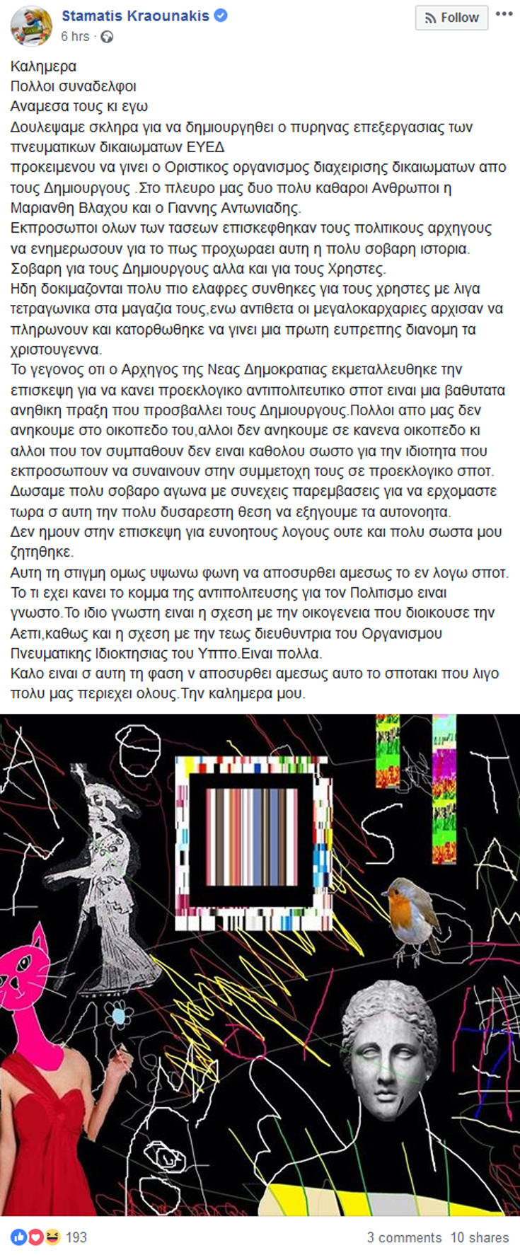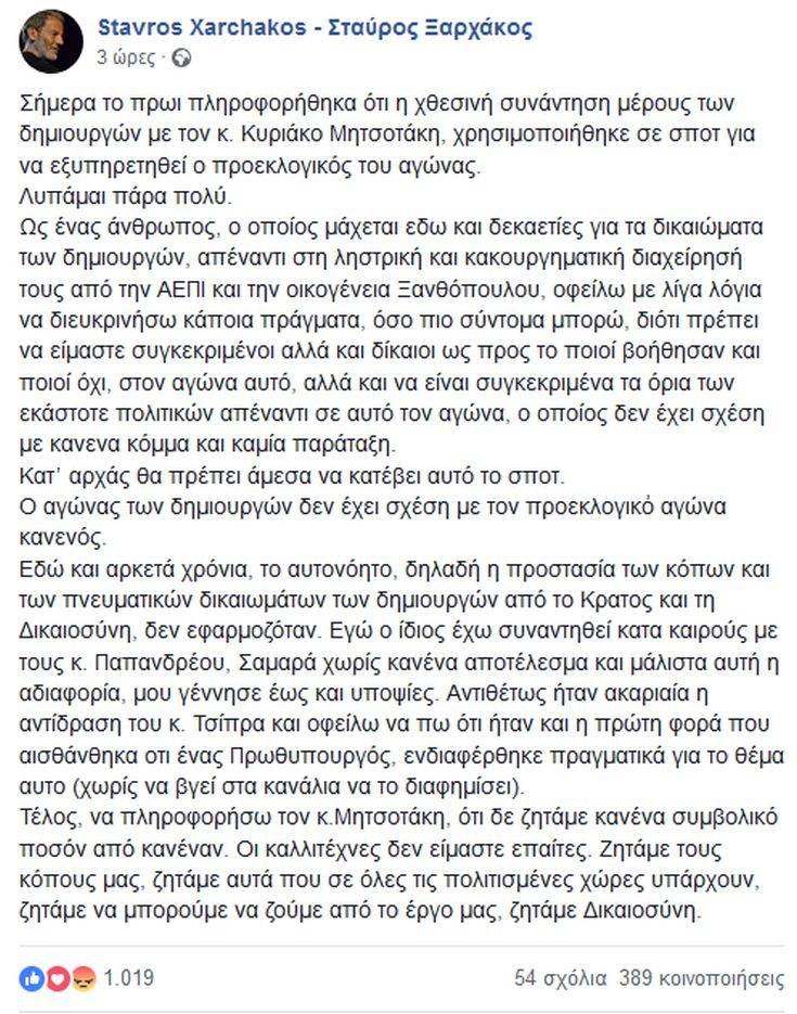 «Σήμερα το πρωι πληροφορήθηκα ότι η χθεσινή συνάντηση μέρους των δημιουργών με τον κ. Κυριάκο Μητσοτάκη, χρησιμοποιήθηκε σε σποτ για να εξυπηρετηθεί ο προεκλογικός του αγώνας.