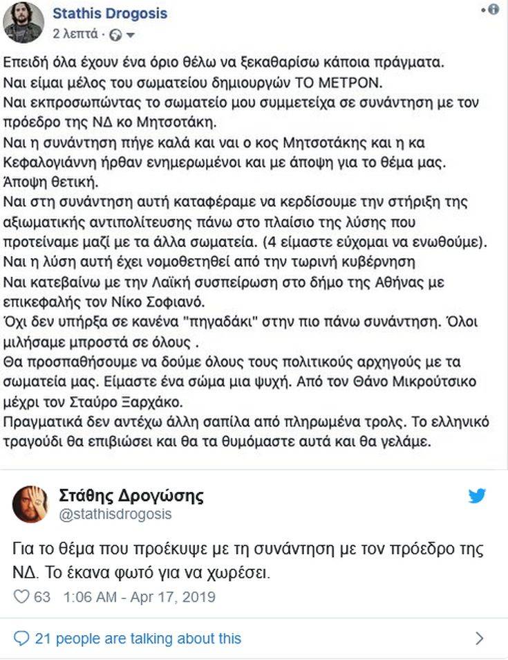 Αντίστοιχες αναρτήσεις έγιναν και από τον Στάθη Δρογώση και τον Σταμάτη Κραουνάκη: