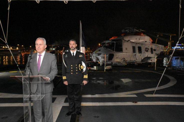Σε εκδήλωση επί της γαλλικής φρεγάτας «Languedoc», η οποία ολοκληρώνει σήμερα την εθιμοτυπική επίσκεψή της στον Πειραιά, παρέστη χθες ο υπουργός Εθνικής Άμυνας Ευάγγελος Αποστολάκης, κατόπιν πρόσκλησης του πρέσβη της Γαλλίας στην Ελλάδα, Κριστόφ Σαντεπί.