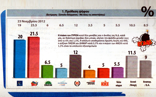 Συγκεκριμένα τα ποσοστά των κομμάτων διαμορφώνεται ως εξής: ΝΔ 20%, ΣΥΡΙΖΑ 21,5%, ΠΑΣΟΚ 6,5%, ΑΝ. ΕΛΛΗΝΕΣ 5%, ΧΡΥΣΗ ΑΥΓΗ 12%, ΔΗΜΑΡ 4%, KKE 5%.