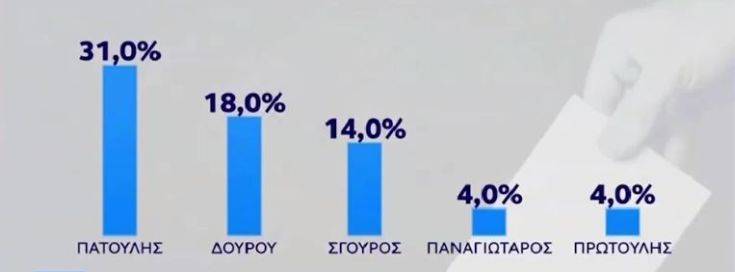 Ο Γιώργος Πατούλης εμφανίζει σημαντικό προβάδισμα και στην πρόθεση ψήφου της πρώτης Κυριακής των εκλογών. Στην ερώτηση «ποιον θα ψηφίζατε για περιφερειάρχη» το 31% των ερωτηθέντων απάντησε τον Γιώργο Πατούλη, το 18% τη Ρένα Δούρου, το 14% τον Γιάννη Σγουρό, το 4% τον Γιάννη Πρωτούλη και το 4% τον Ηλία Παναγιώταρο.
