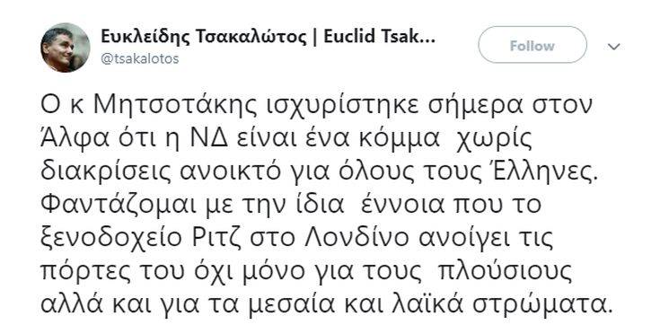 Χθες το βράδυ, επίσης, ο υπουργός Οικονομικών είχε αναρτήσει ένα άλλο τιτίβισμα για τον πρόεδρο της ΝΔ, γράφοντας: «Ο κ. Μητσοτάκης ισχυρίστηκε σήμερα στον Άλφα ότι η ΝΔ είναι ένα κόμμα χωρίς διακρίσεις ανοικτό για όλους τους Έλληνες. Φαντάζομαι με την ίδια έννοια που το ξενοδοχείο Ριτζ στο Λονδίνο ανοίγει τις πόρτες του όχι μόνο για τους πλούσιους αλλά και για τα μεσαία και λαϊκά στρώματα».