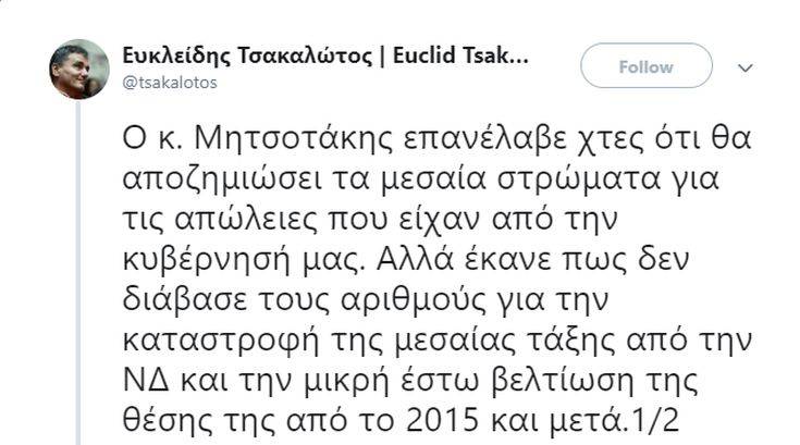 «Ο κ. Μητσοτάκης επανέλαβε χτες ότι θα αποζημιώσει τα μεσαία στρώματα για τις απώλειες που είχαν από την κυβέρνησή μας. Αλλά έκανε πως δεν διάβασε τους αριθμούς για την καταστροφή της μεσαίας τάξης από την ΝΔ και την μικρή έστω βελτίωση της θέσης της από το 2015 και μετά.