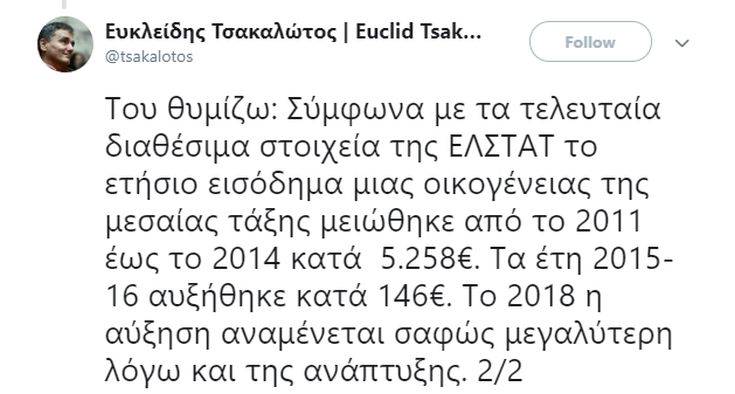 Στο εισόδημα της μεσαίας τάξης αναφέρθηκε μέσω ανάρτησής του στο Twitter ο υπουργός Οικονομικών, Ευκλείδης Τσακαλώτος. Όπως χαρακτηριστικά επισήμανε, απαντώντας στα όσα είπε ο πρόεδρος της Νέας Δημοκρατίας, Κυριάκος Μητσοτάκης, κατά τη διάρκεια της συνέντευξής του στον Alpha, αυτό αυξήθηκε κατά τη διετία 2015-16, ενώ αναμένεται η αύξηση να είναι ακόμη μεγαλύτερη το 2018.