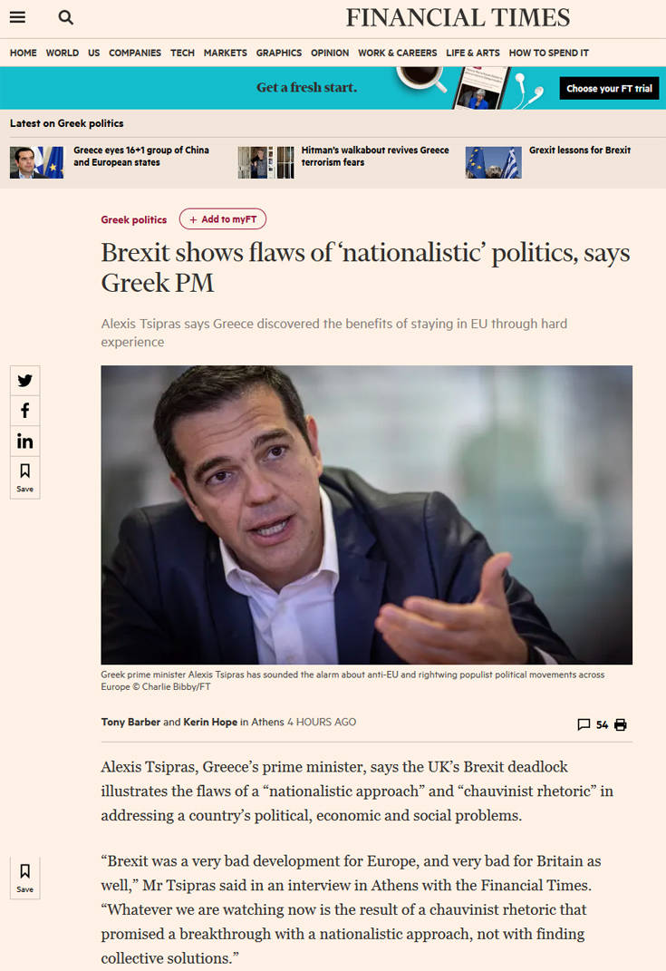 Στη συνέντευξή του στη βρετανική εφημερίδα ο πρωθυπουργός αναφέρεται στο Brexit,κάνοντας λόγο για μια «εθνικιστική προσέγγιση» και μία «σωβινιστική ρητορική» στην αντιμετώπιση των πολιτικών, οικονομικών και κοινωνικών προβλημάτων.