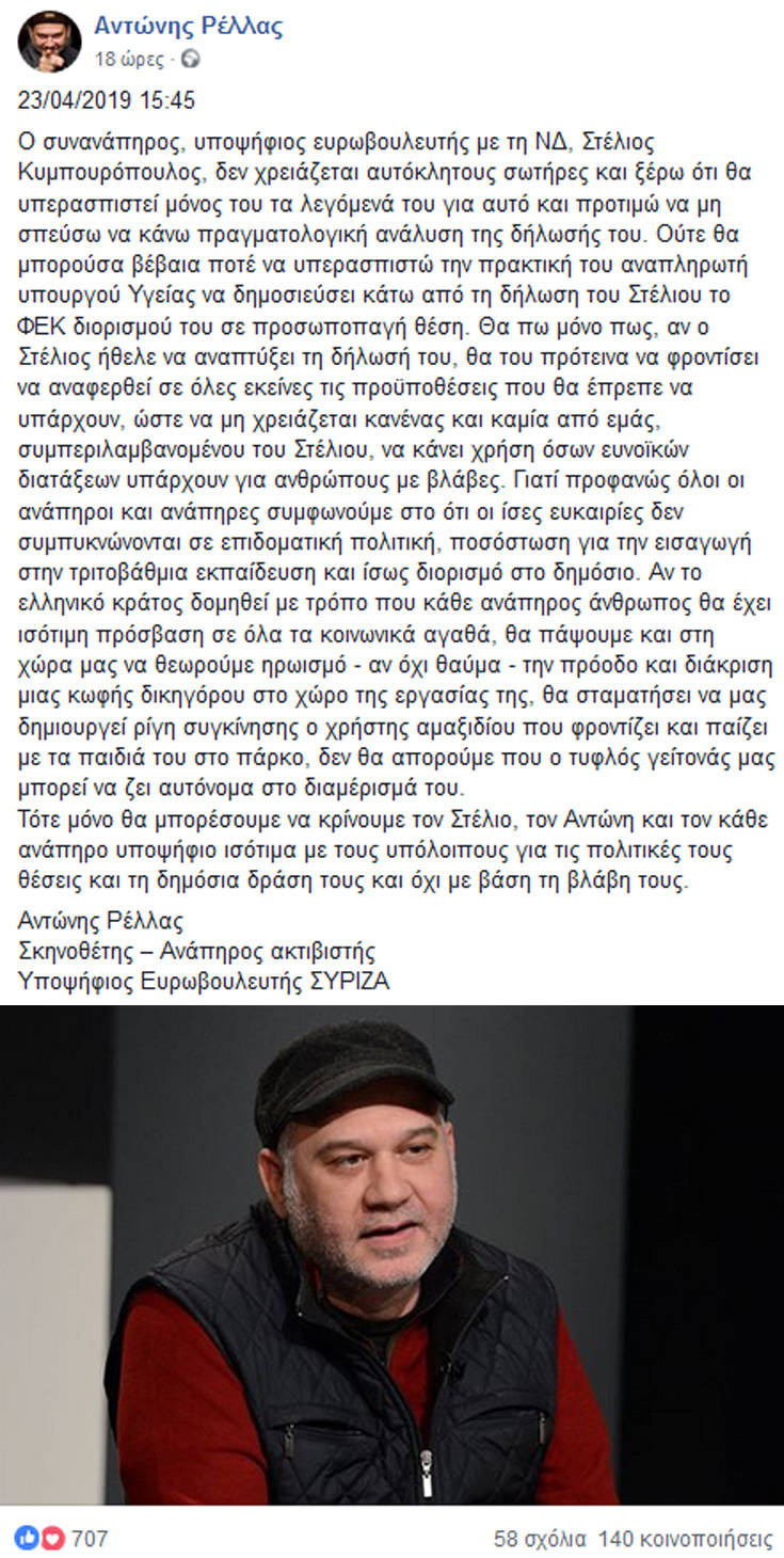 Θέση για το θέμα που προέκυψε μετά την ανάρτηση του αναπληρωτή υπουργού Υγείας, Παύλου Πολάκη, σε μέσο κοινωνικής δικτύωσης, για τον υποψήφιο ευρωβουλευτή της ΝΔ Στέλιο Κυμπουρόπουλο, πήρε με δήλωσή του ο υποψήφιος ευρωβουλευτής του ΣΥΡΙΖΑ, Αντώνης Ρέλλας, ο οποίος επίσης είναι ΑμεΑ.