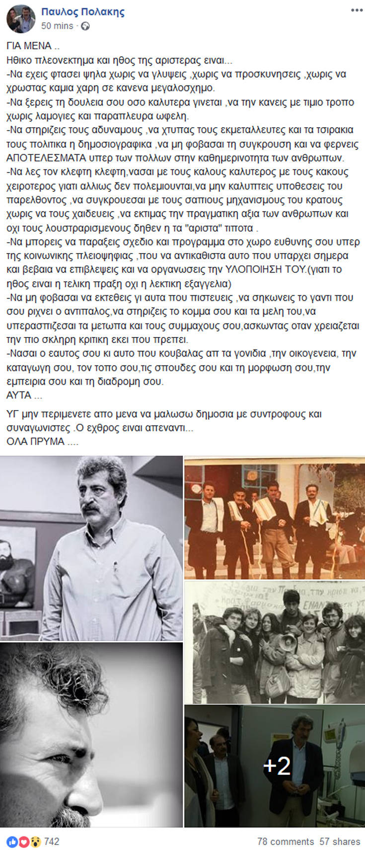 Με μια νέα ανάρτησή του στο Facebook, η οποία συνοδεύεται από φωτογραφίες από στιγμές της ζωής του, ο Παύλος Πολάκης αναφέρεται στο «ηθικό πλεονέκτημα και ήθος της αριστεράς», στον απόηχο των όσων είπε για τον Στέλιο Κυμπουρόπουλο αλλά και της κριτικής που δέχτηκε εντός και εκτός ΣΥΡΙΖΑ.