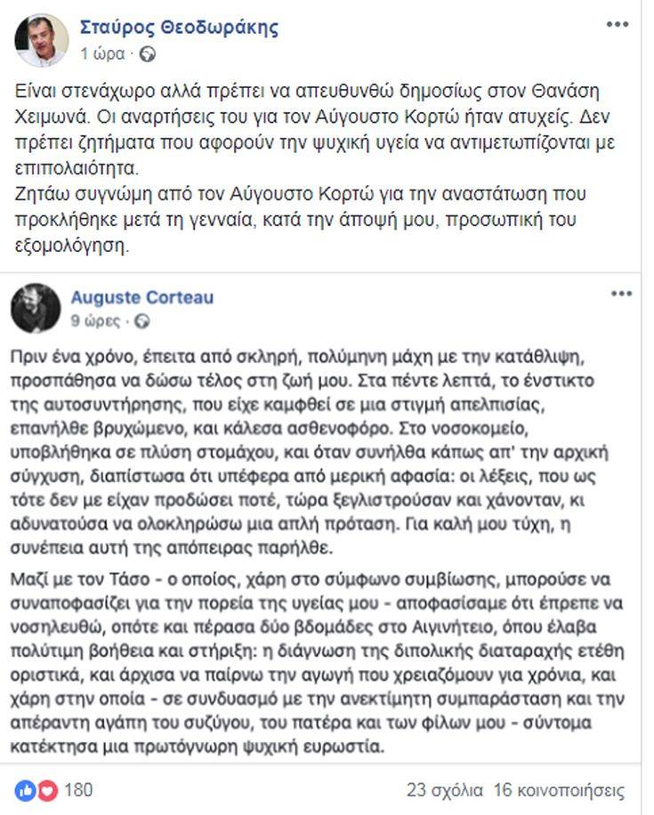 «Είναι στενάχωρο αλλά πρέπει να απευθυνθώ δημοσίως στον Θανάση Χειμωνά. Οι αναρτήσεις του για τον Αύγουστο Κορτώ ήταν ατυχείς. Δεν πρέπει ζητήματα που αφορούν την ψυχική υγεία να αντιμετωπίζονται με επιπολαιότητα. Ζητάω συγνώμη από τον Αύγουστο Κορτώ για την αναστάτωση που προκλήθηκε μετά τη γενναία, κατά την άποψή μου, προσωπική του εξομολόγηση», ανέφερε ο επικεφαλής του Ποταμιού.