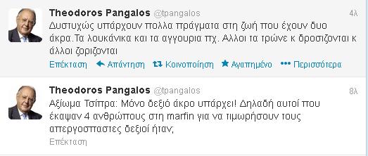 Στο λογαριασμό που διατηρεί στο twitter έγραψε “Αξίωμα Τσίπρα: Μόνο δεξιό άκρο υπάρχει! Δηλαδή αυτοί που έκαψαν 4 ανθρώπους στη marfin για να τιμωρήσουν τους απεργοσπάστες δεξιοί ήταν;». Και συνέχισε: