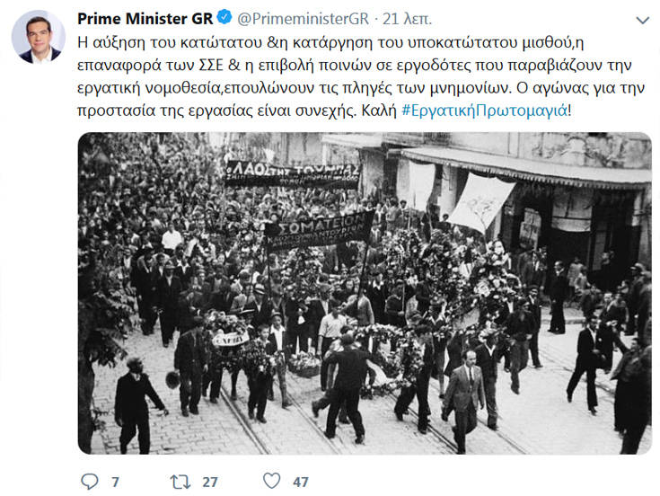 «Η αύξηση του κατώτατου και η κατάργηση του υποκατώτατου μισθού, η επαναφορά των ΣΣΕ & η επιβολή ποινών σε εργοδότες που παραβιάζουν την εργατική νομοθεσία, επουλώνουν τις πληγές των μνημονίων», υπογραμμίζει ο πρωθυπουργός, Αλέξης Τσίπρας σε ανάρτησή του στο Twitter για την Εργατική Πρωτομαγιά.