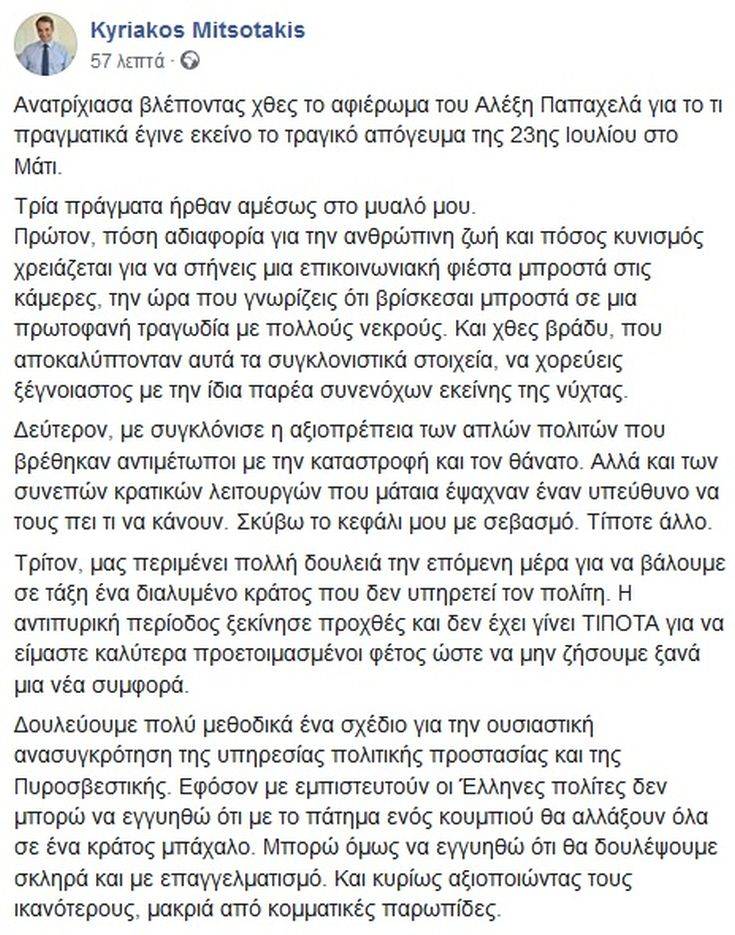 Μετά την προβολή του ντοκιμαντέρ «Μάτι: Τα ντοκουμέντα μιλούν», μια έρευνα του Αλέξη Παπαχελά που προβλήθηκε στον ΣΚΑΪ, ο πρόεδρος της ΝΔ έκανε μια μακροσκελή δημοσίευση στο Facebook ρίχνοντας τα πυρά του στον Αλέξη Τσίπρα και τον τρόπο που χειρίστηκε την τραγωδία.