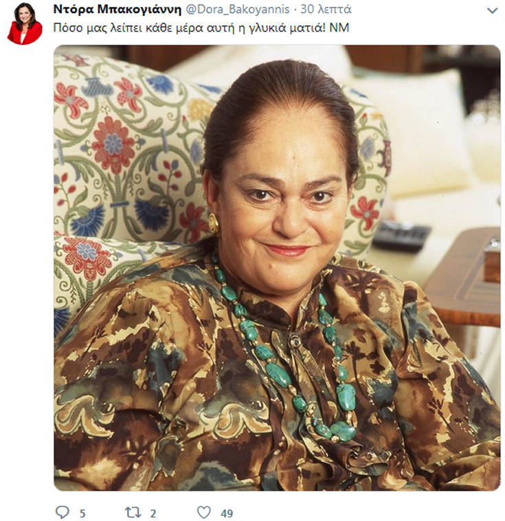 Επτά χρόνια πέρασαν από τον θάνατο της Μαρίκας Μητσοτάκη και η Ντόρα Μπακογιάννη με ανάρτησή της στο Twitter εκφράζει το πόσο της λείπει η μητέρα της, που έφυγε από τη ζωή σαν σήμερα, το 2012.