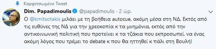«Ο Κυριάκος Μητσοτάκης μιλάει με τη βοήθεια autocue, ακόμη μέσα στη ΝΔ. Εκτός από τις ευθύνες της ΝΔ για τη χρεοκοπία και τα μνημόνια, εκτός από την αντικοινωνική πολιτική που προτείνει και τα τζάκια που εκπροσωπεί, να ένας ακόμη λόγος που τρέμει το debate και που θα ηττηθεί και πάλι στη Βουλή!» αναφέρει ο αντιπρόεδρος του Ευρωκοινοβουλίου και επικεφαλής της ευρωομάδας του ΣΥΡΙΖΑ Δημήτρης Παπαδημούλης.