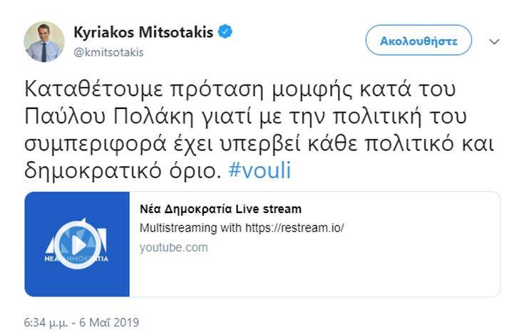 Ο αρχηγός της ΝΔ ανέφερε ότι «καταθέτουμε πρόταση μομφής κατά του Παύλου Πολάκη γιατί με την πολιτική του συμπεριφορά έχει υπερβεί κάθε πολιτικό και δημοκρατικό όριο».