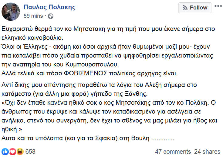 Αυτή είναι η ανάρτηση του Παύλου Πολάκη: