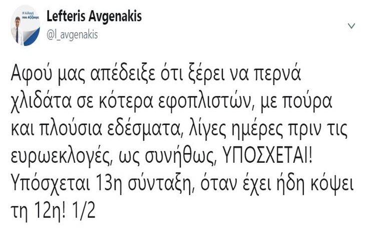 «Αφού μας απέδειξε ότι ξέρει να περνά χλιδάτα σε κότερα εφοπλιστών, με πούρα και πλούσια εδέσματα, λίγες ημέρες πριν τις ευρωεκλογές, ως συνήθως, ΥΠΟΣΧΕΤΑΙ! Υπόσχεται 13η σύνταξη, όταν έχει ήδη κόψει τη 12η» έγραψε αρχικά ο κ. Αυγενάκης, ο οποίος λίγο αργότερα επανήλθε τονίζοντας: