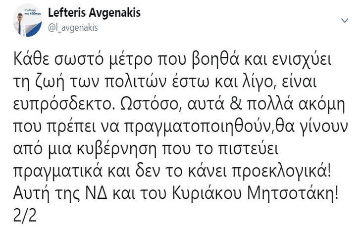 «Κάθε σωστό μέτρο που βοηθά και ενισχύει τη ζωή των πολιτών έστω και λίγο, είναι ευπρόσδεκτο. Ωστόσο, αυτά και πολλά ακόμη που πρέπει να πραγματοποιηθούν, θα γίνουν από μια κυβέρνηση που το πιστεύει πραγματικά και δεν το κάνει προεκλογικά! Αυτή της ΝΔ και του Κυριάκου Μητσοτάκη»!