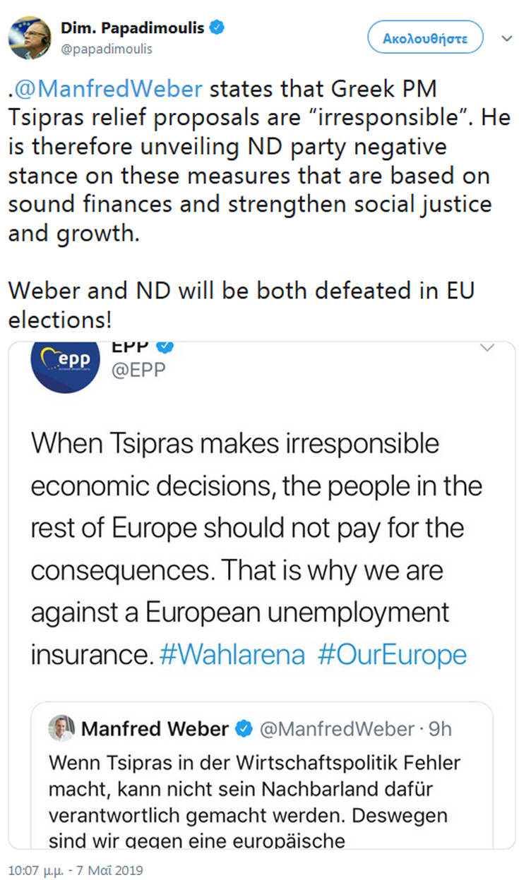 Συγκεκριμένα, ο Μάνφρεντ Βέμπερ έγραψε στο Twitter: «Όταν ο Τσίπρας παίρνει ανεύθυνες οικονομικές αποφάσεις, ο λαός της υπόλοιπης Ευρώπης δεν πρέπει να πληρώσει για τις συνέπειες. Αυτός είναι ο λόγος για τον οποίο είμαστε εναντίον μίας ευρωπαϊκής ασφάλισης στους ανέργους».
