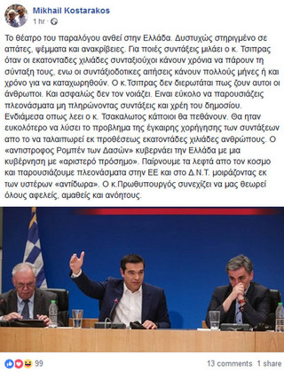 Τα όσα ανακοίνωσε η κυβέρνηση και ο Αλέξης Τσίπρας το βράδυ της Τρίτης σχολιάζει με ανάρτησή του στα social media, ο στρατηγός Μιχάλης Κωσταράκος, κάνοντας λόγο για «θέατρο του παραλόγου ανθεί στην Ελλάδα».
