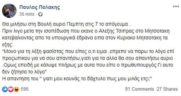 «Θα μιλήσω στη Βουλή αύριο Πέμπτη στις 7 το απόγευμα. Πριν λίγο μετά την ισοπέδωση που έκανε ο Αλέξης Τσίπρας στο Μητσοτάκη κατεβαίνοντας από τα υπουργικά έδρανα είπα στον Κυριάκο Μητσοτάκη τα εξής: “Μόνο για τη λέξη φασίστας που είπες ο,τι είμαι , έπρεπε να πάρω το λόγο επί προσωπικού για να σου απαντήσω, γιατί για τα αλλά θα σου απαντήσω αύριο. Όμως επειδή με κάλυψε πλήρως με αυτά που είπε ο πρωθυπουργός Για αυτό δεν ζήτησα το λόγο” Η απάντησή του “γιατί μου κουνάς το δάχτυλο πως μου μιλάς έτσι;”».