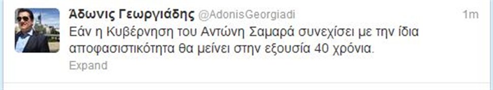 Ο βουλευτής της Νέας Δημοκρατίας σχολίασε στο twitter ότι «εάν κυβέρνηση του Αντώνη Σαμαρά συνεχίσει με την ίδια αποφασιστικότητα, θα μείνει στην εξουσία 40 χρόνια».