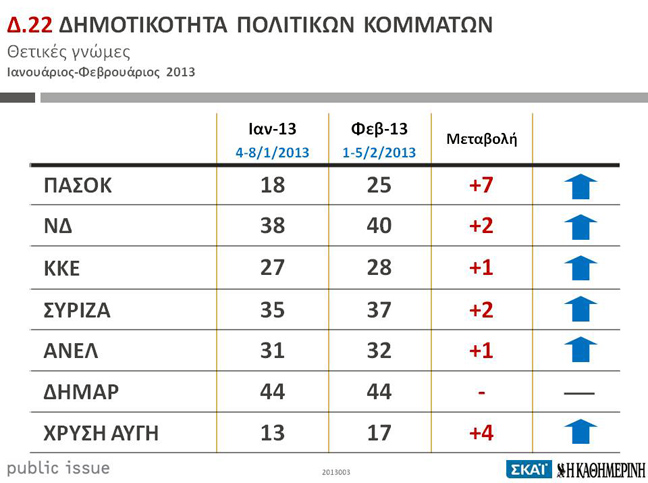Σε ό,τι αφορά τη δημοτικότητα των κομμάτων σημαντική άνοδο επτά μονάδων καταγράφει το ΠΑΣΟΚ, ενώ ακολουθεί η Χρυσή Αυγή, αποσπώντας τη θετική γνώμη του 17% των ερωτηθέντων (+4 μονάδες).