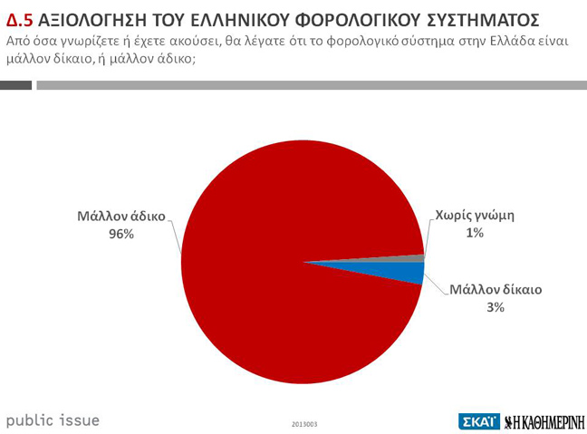 Στο μέτωπο της οικονομίας, το 96% των ερωτηθέντων θεωρεί πως το φορολογικό σύστημα είναι «μάλλον άδικο», έναντι μόλις 3% που κρίνει ότι είναι «μάλλον δίκαιο».