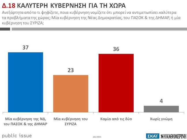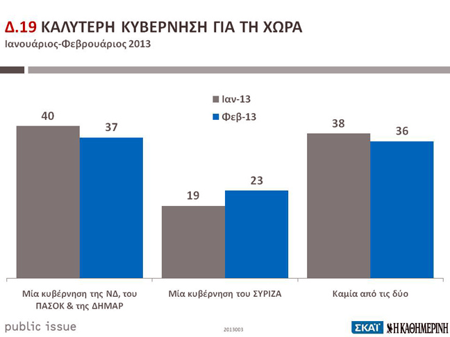 Υποχώρηση σημειώνεται για την συγκυβέρνηση, καθώς υπάρχει μεγαλύτερη μερίδα των πολιτών που εκφράζεται αρνητικά για την κυβέρνηση. Ο ΣΥΡΙΖΑ παραμένει δεύτερος (23%, από 19% τον Ιανουάριο) αλλά μειώνει την «ψαλίδα» που τον χωρίζει από την τρικομματική κυβέρνηση (37%, από 40% τον Ιανουάριο).
