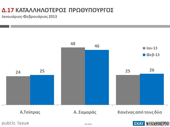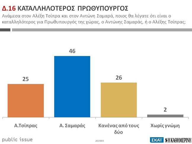 Ο πρόεδρος της Νέας Δημοκρατίας κρίθηκε καταλληλότερος πρωθυπουργός από το 46% των ελλήνων πολιτών, ενώ ο επικεφαλής του ΣΥΡΙΖΑ θεωρήθηκε καταλληλότερος από το 25%, καταγράφοντας άνοδο μίας μονάδας.