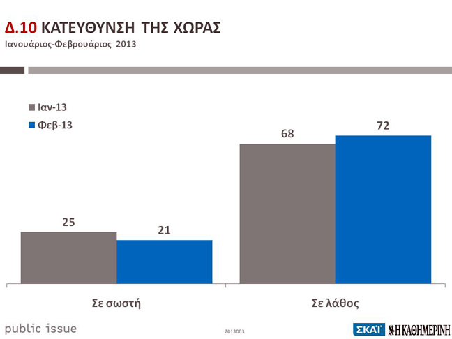 Το 72% κρίνει ότι η Ελλάδα βρίσκεται σε λάθος κατεύθυνση, ενώ μόλις το 21% των ερωτηθέντων γνωμοδοτεί πως βρίσκεται στη σωστή. Επιπλέον, το 63% τονίζει την ανάγκη «βαθιών αλλαγών» στην κοινωνία, ενώ το 23% δηλώνει πως χρειάζεται «ριζική αλλαγή» της κοινωνίας μέσω «επανάστασης».