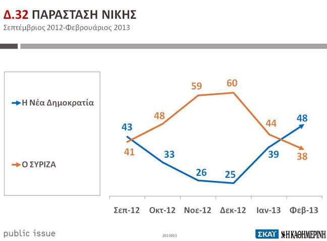 Στην παράσταση νίκης η Νέα Δημοκρατία εμφανίζεται ως ο αδιαφιλονίκητος νικητής συγκεντρώνοντας ποσοστό 48%, με διαφορά 10 ποσοστιαίων μονάδων για πρώτη φορά, ενώ ο ΣΥΡΙΖΑ υποχωρεί στο 38%, και ανατρέποντας το προβάδισμα 5 μονάδων που είχε ο ΣΥΡΙΖΑ τον Ιανουάριο (44% έναντι 39%).