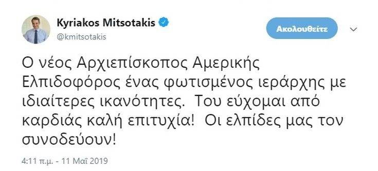 Μέσω twitter στέλνει τις ευχές του ο πρόεδρος της ΝΔ Κυριάκος Μητσοτάκης για την ενθρόνιση του νέου Αρχιεπισκόπου Αμερικής: «Ο νέος Αρχιεπίσκοπος Αμερικής Ελπιδοφόρος ένας φωτισμένος ιεράρχης με ιδιαίτερες ικανότητες. Του εύχομαι από καρδιάς καλή επιτυχία! Οι ελπίδες μας τον συνοδεύουν!» αναφέρει στο tweet του ο Κυριάκος Μητσοτάκης.