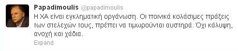 «Η ΧΑ είναι εγκληματική οργάνωση. Οι ποινικά κολάσιμες πράξεις των στελεχών τους, πρέπει να τιμωρούνται αυστηρά. Όχι κάλυψη, ανοχή και χάδια».έγραψε στο twitter ο Δημήτρης Παπαδημούλης, με αφορμή την σύλληψη δύο οπλισμένων στελεχών της Χρυσής Αυγής, σε τυχαίο έλεγχο.