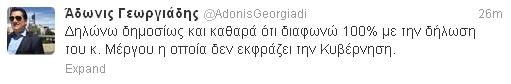 «Δηλώνω δημοσίως και καθαρά ότι διαφωνώ 100% με την δήλωση του κ. Μέργου η οποία δεν εκφράζει την Κυβέρνηση», έγραψε στο Twitter ο κ. Γεωργιάδης.