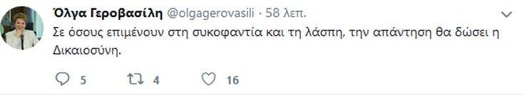 Σε tweet που ανάρτησε πριν από λίγο η υπουργός Προστασίας του Πολίτη αναφέρει: «Σε όσους επιμένουν στη συκοφαντία και τη λάσπη την απάντηση θα δώσει η Δικαιοσύνη».