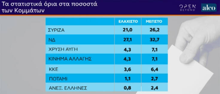 Όσον αφορά τα στατιστικά όρια των κομμάτων βλέπουμε ότι στην περίπτωση της ΝΔ το ελάχιστο είναι 27,1% και το μέγιστο 32,7%. Ακολούθως στον ΣΥΡΙΖΑ το ελάχιστο είναι 21% και το μέγιστο 26,2%. Χρυσή Αυγή και ΚΙΝΑΛ έχουν ως ελάχιστο ποσοστό το 4,3% και μέγιστο το 7,1%. Στη συνέχεια παρατηρούμε ότι το ΚΚΕ το ελάχιστο ποσοστό που συγκεντρώνει είναι 3,6% και το μέγιστο 6,4%. Το Ποτάμι έχει ελάχιστο ποσοστό 1,1% και το μέγιστο 2,7%. Στους ΑΝΕΛ το ελάχιστο ποσοστό που δίνεται είναι το 0,5% και το μέγιστο 2,4 και τέλος στην Ένωση Κεντρώων το ελάχιστο είναι 1,6 και το μέγιστο 3,6%.