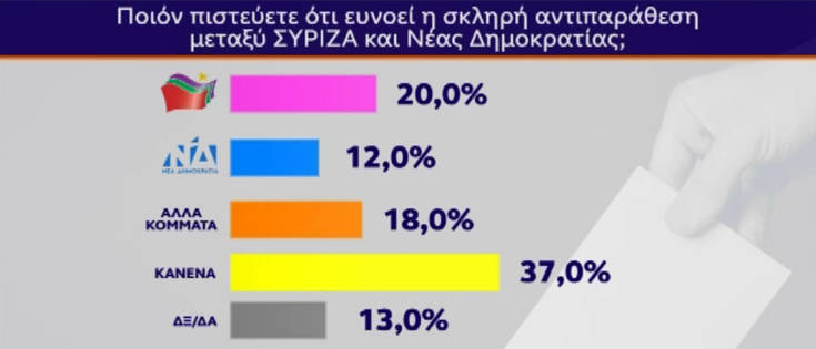Στην ερώτηση «ποιον ευνοεί η σκληρή αντιπαράθεση» οι πολίτες απάντησαν 20% τον ΣΥΡΙΖΑ, 12% τη ΝΔ και άλλα κόμματα 18%. Το 37% πιστεύει ότι δεν ευνοεί κανέναν.