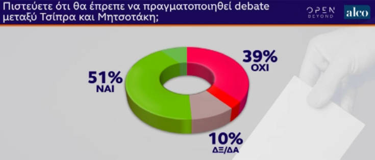 Στο ερώτημα εάν «πιστεύετε ότι θα έπρεπε να πραγματοποιηθεί debate» το 51% απάντησε «Ναι» και το 39% «Όχι».