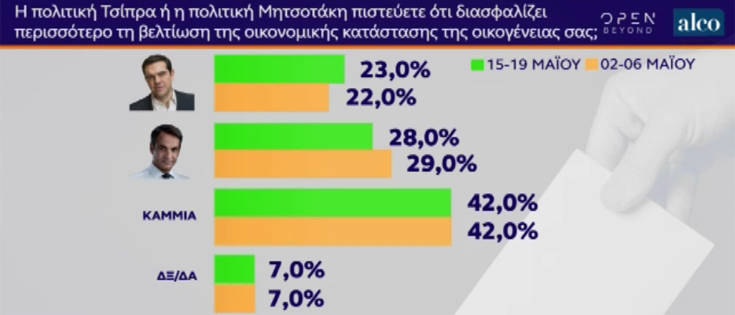 Παράλληλα το 42% των ερωτηθέντων εκτιμά ότι ούτε η πολιτική του Αλέξη Τσίπρα, αλλά ούτε και του Κυριάκου Μητσοτάκη διασφαλίζει περισσότερο τη βελτίωση της οικονομικής κατάστασης μίας οικογένειας.