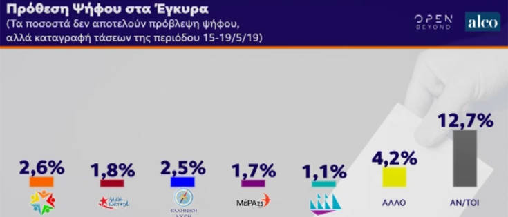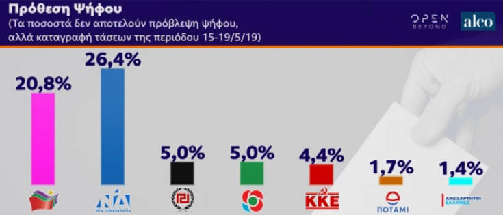 Στην πρόθεση ψήφου η Νέα Δημοκρατία προηγείται με 26,4% έναντι 20,8% του ΣΥΡΙΖΑ. Την πεντάδα κλείνουν Χρυσή Αυγή και ΚΙΝΑΛ με 5% και το ΚΚΕ με 4,4%. Στο 1,7% βρίσκεται το Ποτάμι και στο 1,4% οι ΑΝΕΛ.