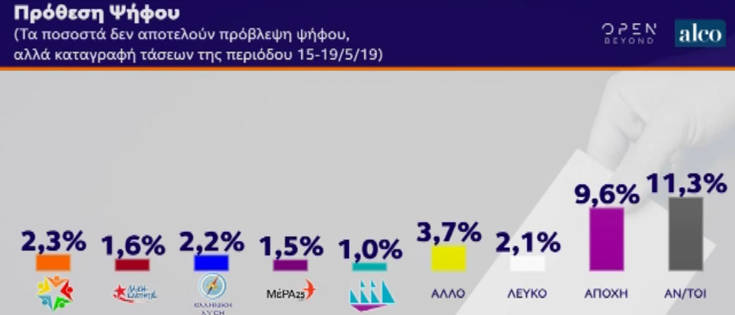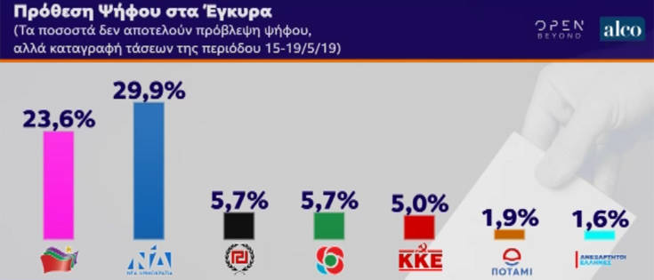 Στη συνέχεια η πρόθεση ψήφου στα έγκυρα δίνει ένα 29,9% στη ΝΔ και ένα 23,6% στον ΣΥΡΙΖΑ. Ενώ ανεβασμένα είναι τα ποσοστά Χρυσής Αυγής και ΚΙΝΑΛ, 5,7% αμφότερα τα κόμματα και 5% το ΚΚΕ. Στο 1,9% βρίσκεται το Ποτάμι και στο 1,6% οι ΑΝΕΛ.