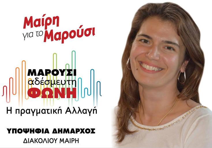 «Η Μαίρη Διακολιού τα τελευταία 20 χρόνια έχει συνεπή πολιτική παρουσία στα προβλήματα της πόλης και ως ενεργός πολίτης και ως εκλεγμένη δημοτική σύμβουλος με αξιοσημείωτη, μαχητική, αδέσμευτη φωνή. Είναι από μικρή μόνιμη κάτοικος, αργότερα έγινε και αυτοαπασχολούμενη επαγγελματίας με γραφείο στο κέντρο της πόλης (μάχιμη δικηγόρος), ενώ στο Μαρούσι μας μεγαλώνει το παιδί της.