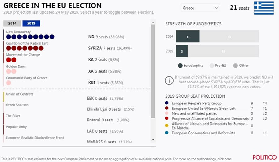 Με βάση την πρόβλεψη του Politico, η Νέα Δημοκρατία θα καταλάβει εννιά έδρες στην Ευρωβουλή, έναντι επτά του ΣΥΡΙΖΑ και δύο του ΚΙΝΑΛ και της Χρυσής Αυγής. Το ΚΚΕ φαίνεται να καταλαμβάνει μία έδρα.