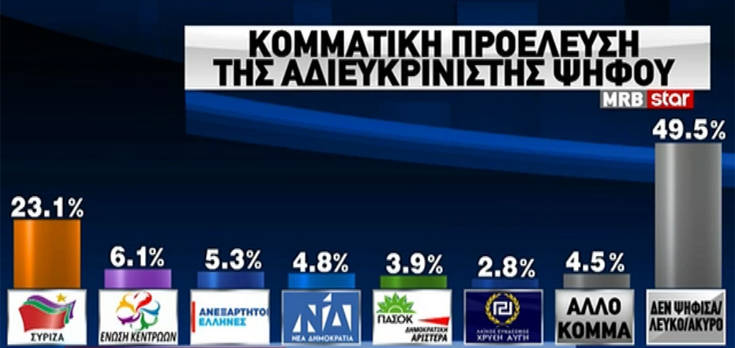 Μεγάλη δημοσκόπηση λίγες ώρες πριν παύσει κάθε μετάδοση προεκλογικού λόγου μετέδωσε το Star στο κεντρικό του δελτίο ειδήσεων. Η έρευνα της MRB έγινε σε δείγμα 1.000 ατόμων και πραγματοποιήθηκε με κλήσεις σε σταθερά τηλέφωνα αλλά και μέσω ίντερνετ.